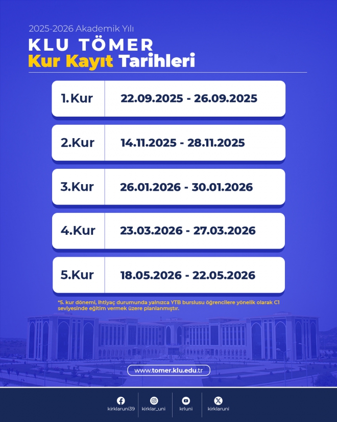 KLU TÖMER 2025-2026 Eğitim-Öğretim Yılı Kur Kayıt Takvimi aşağıdaki tabloda belirtilmiştir.