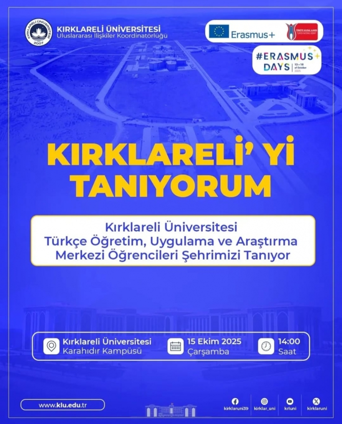 Our university's Foreign Relations Coordination Office will organise an event entitled ‘Getting to Know Kırklareli’ for KLU TÖMER students as part of #Erasmus Days.