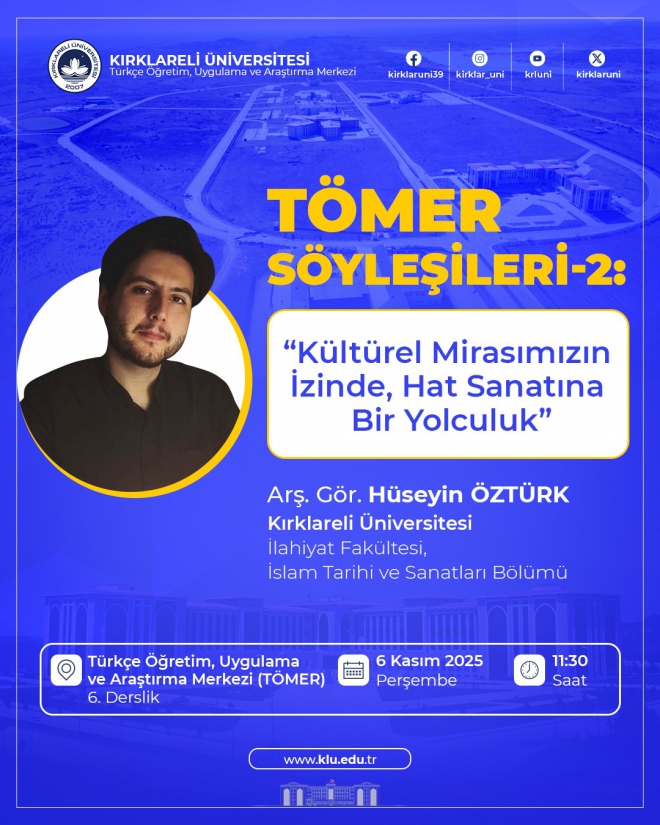 "TÖMER Söyleşileri" etkinliği kapsamında Arş. Gör. Hüseyin ÖZTÜRK'ün konuşmacı olarak katılacağı "Kültürel Mirasımızın İzinde Hat Sanatına Bir Yolculuk" başlıklı söyleşi düzenlenecektir.