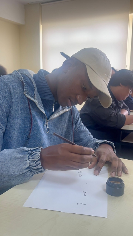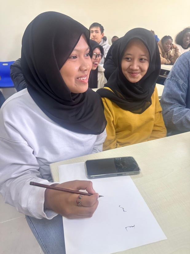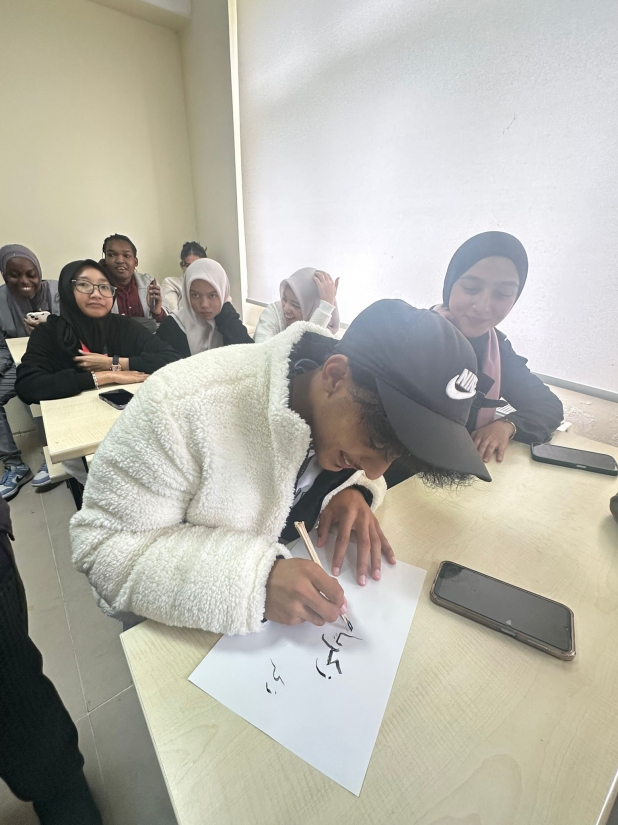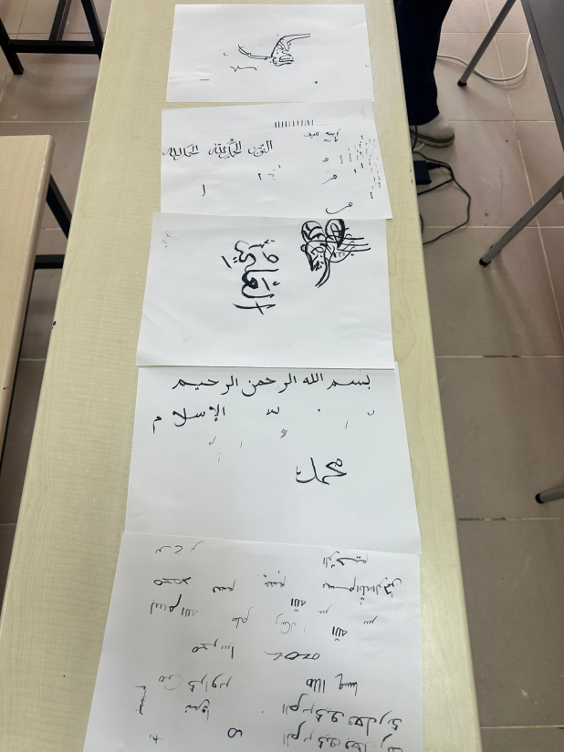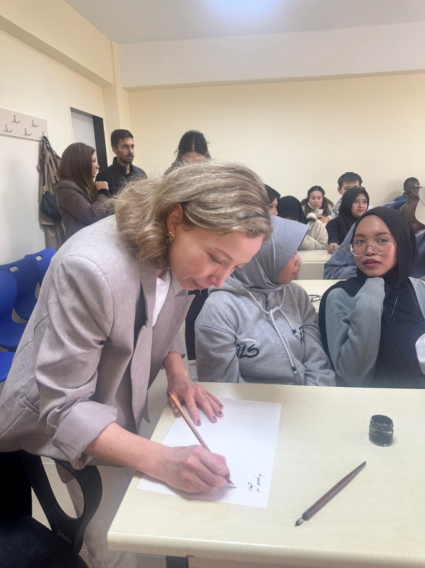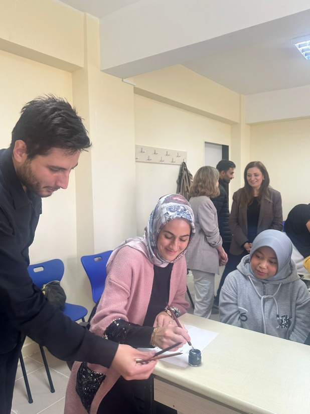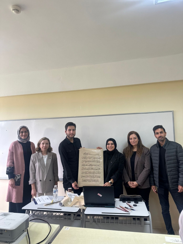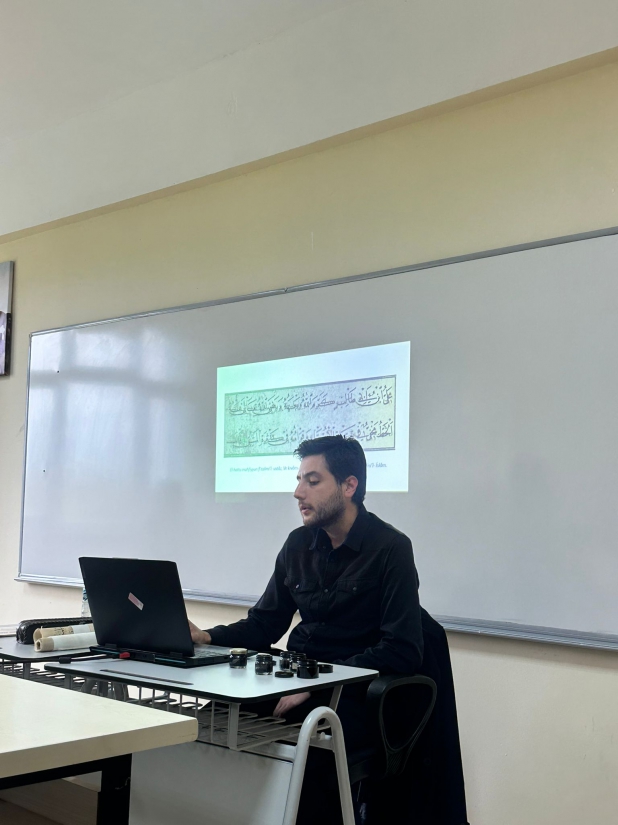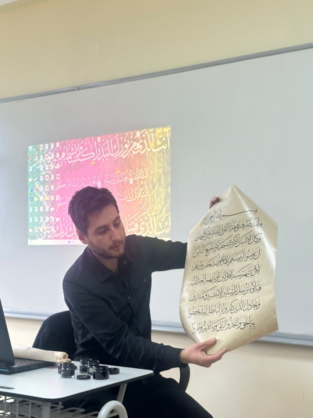 Following the presentation, Research Assistant Hüseyin Öztürk shared calligraphy samples he had brought with him with the participants. He then introduced the materials used in calligraphy and conducted a practical workshop with the students and academic staff.