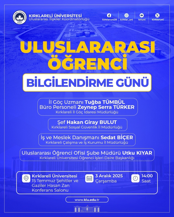 Kırklareli University International Relations Coordination Office will organise an ‘International Student Information Day’ to inform international students about their legal obligations in Turkey, social security rights and university processes. The event will take place on Wednesday, 3 December 2025, at 2:00 p.m. in the Hasan Zan Conference Hall.As part of the programme, representatives from the Migration Administration, SGK, İŞKUR and the Kırklareli University Student Affairs Directorate will give presentations; questions regarding administrative processes that students frequently encounter will be answered. The event will enable students to communicate directly with official institutions and to better understand their rights and responsibilities within the university.