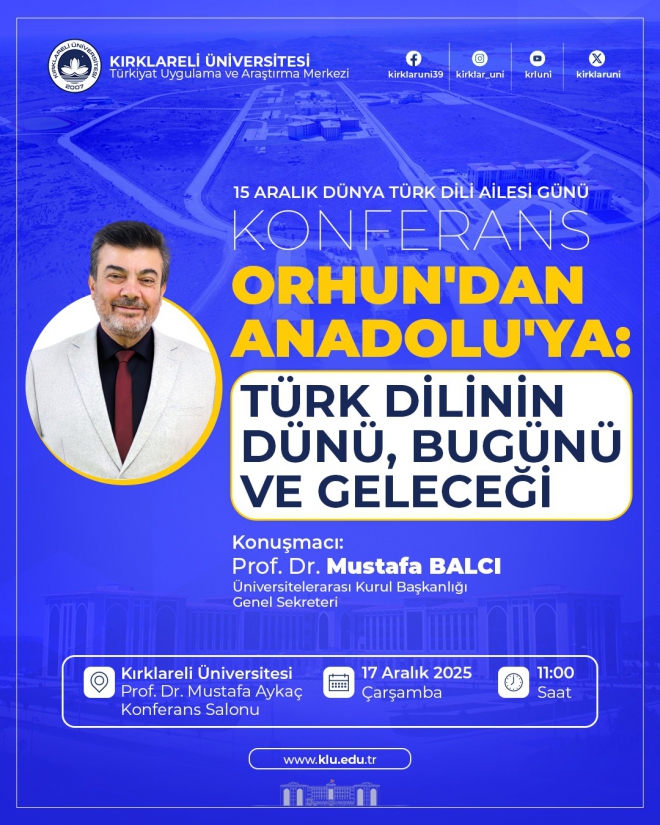 Üniversitemiz Türkiyat Uygulama ve Araştırma Merkezi tarafından, 15 Aralık Dünya Türk Dili Ailesi Günü etkinlikleri kapsamında “Orhun'dan Anadolu'ya: Türk Dilinin Dünü, Bugünü ve Geleceği” konu başlıklı konferans düzenlenecektir.