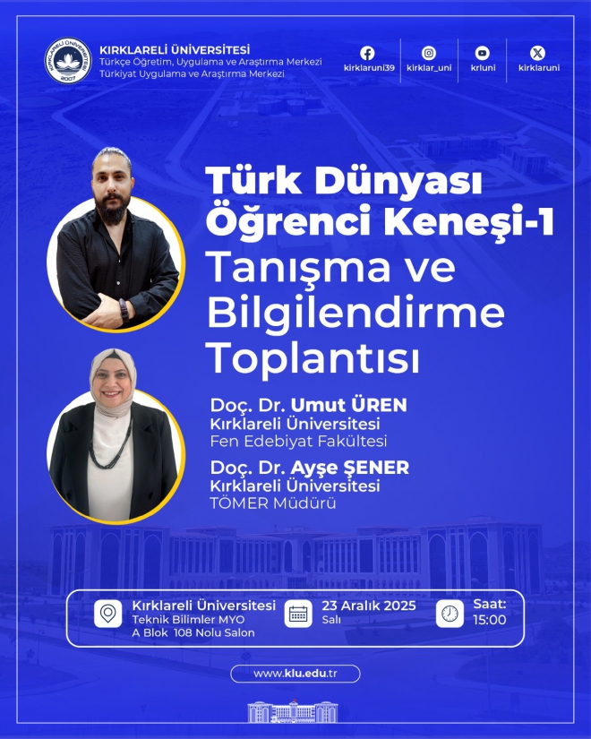 Üniversitemiz Türkçe Öğretim, Uygulama ve Araştırma Merkezi ve Türkiyat Uygulama ve Araştırma Merkezi işbirliğinde “Türk Dünyası Öğrenci Keneşi-1” başlıklı tanışma ve bilgilendirme toplantısı düzenlenecektir.