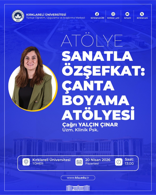 Üniversitemiz Türkçe Öğretim, Uygulama ve Araştırma Merkezi (TÖMER) ve Öğrenci Refah Ofisi iş birliği ile uluslararası öğrencilere yönelik “Sanatla Öz Şefkat: Çanta Boyama Atölyesi” başlıklı etkinlik düzenlenecektir.