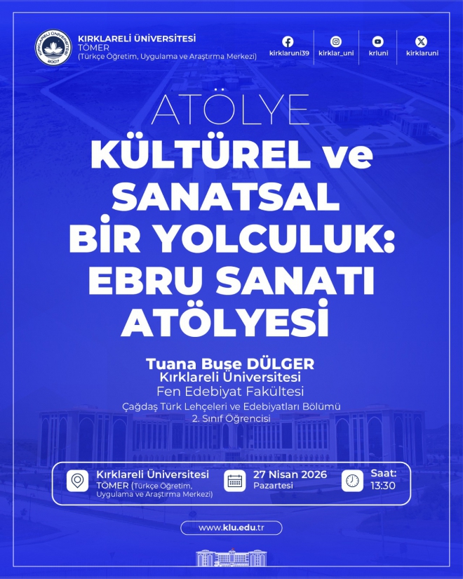 Üniversitemiz Fen Edebiyat Fakültesi Çağdaş Türk Lehçeleri ve Edebiyatları Bölümü 2. sınıf öğrencisi Tuana Buse Dülger’in yürüteceği atölye katılımcılara ebru sanatını tanıma ve uygulama imkânı sunacaktır.